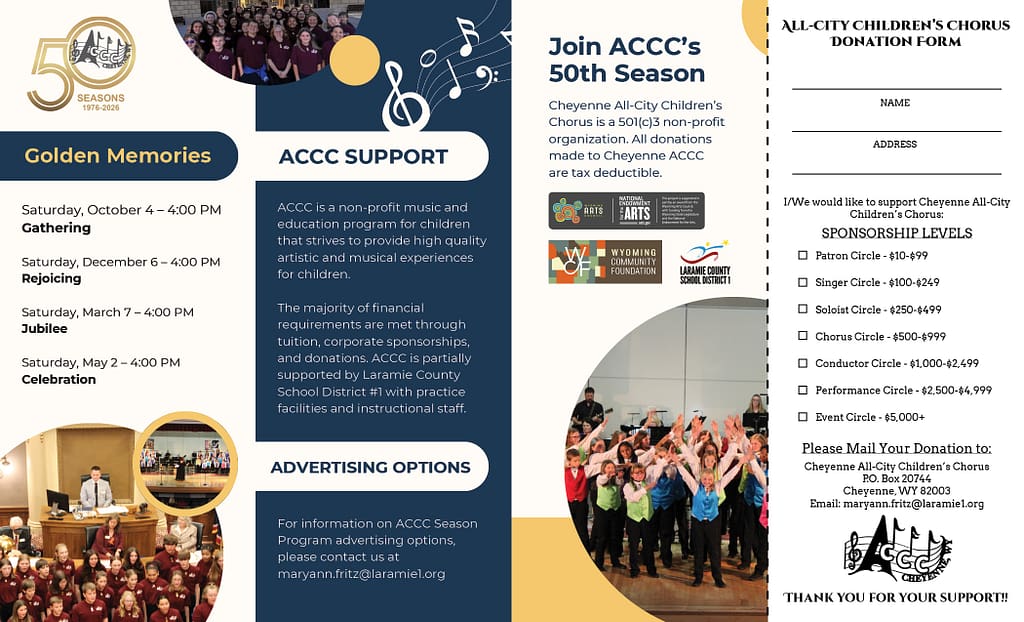Cheyenne All-City Children’s Chorus is a 501(c)3 non-profit organization. All donations made to Cheyenne ACCC are tax deductible.